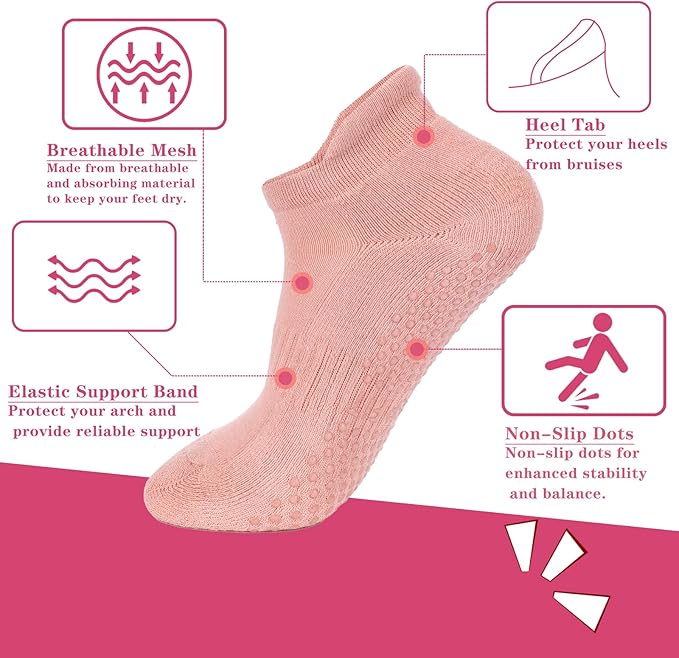 - Non slip Pilates Socks: These ankle socks for women feature sticky silicone grips with a beautiful pattern on the bottom, providing excellent traction during Pilates and other activities.Those Non Slip Barre Socks can provide better stability & balance on the floor surface Perfect for pilates,yoga,fitness,ballet,and more