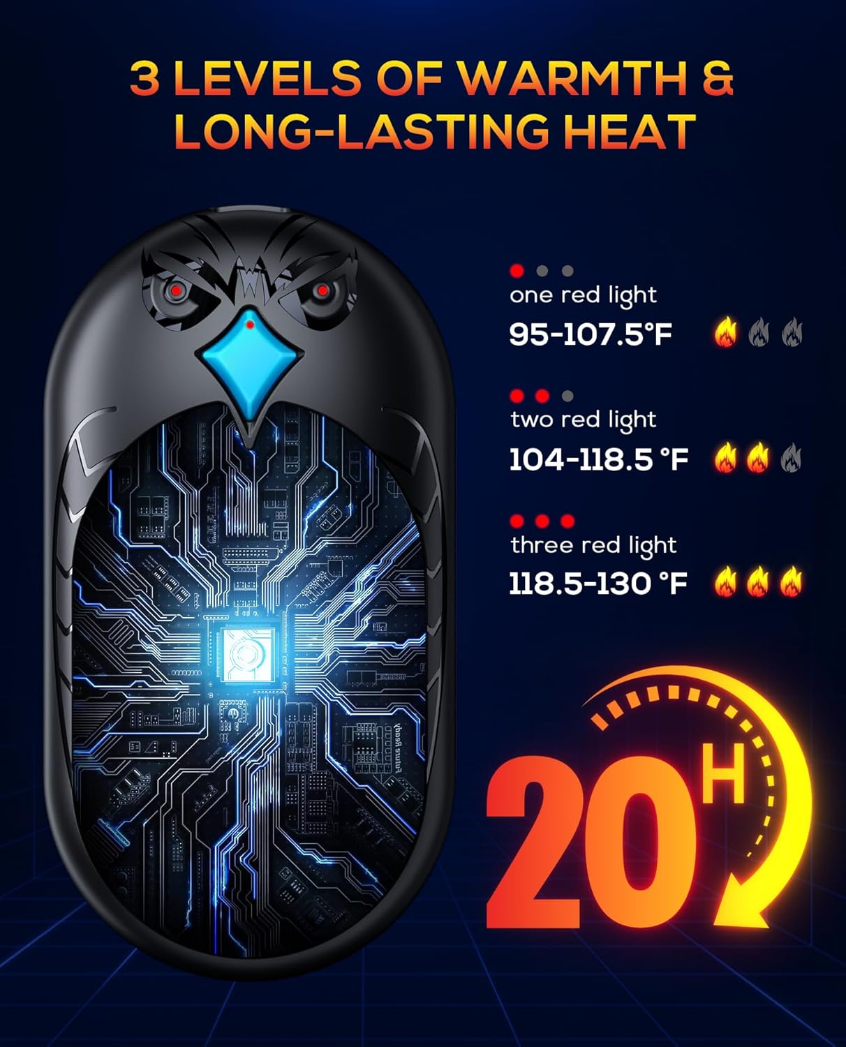 - 【2s Instant Heat & 3 Heat Levels】Say goodbye to cold fingers and long wait times. Featuring a premium chip control system, these electric hot pockets hand warmers deliver heat up to 130°F in just 2 seconds. With 3 temperature levels for stable, adjustable, and precise comfort heating. Give you quick relief from the cold and experience the healing power of heat therapy.