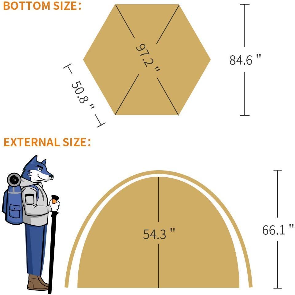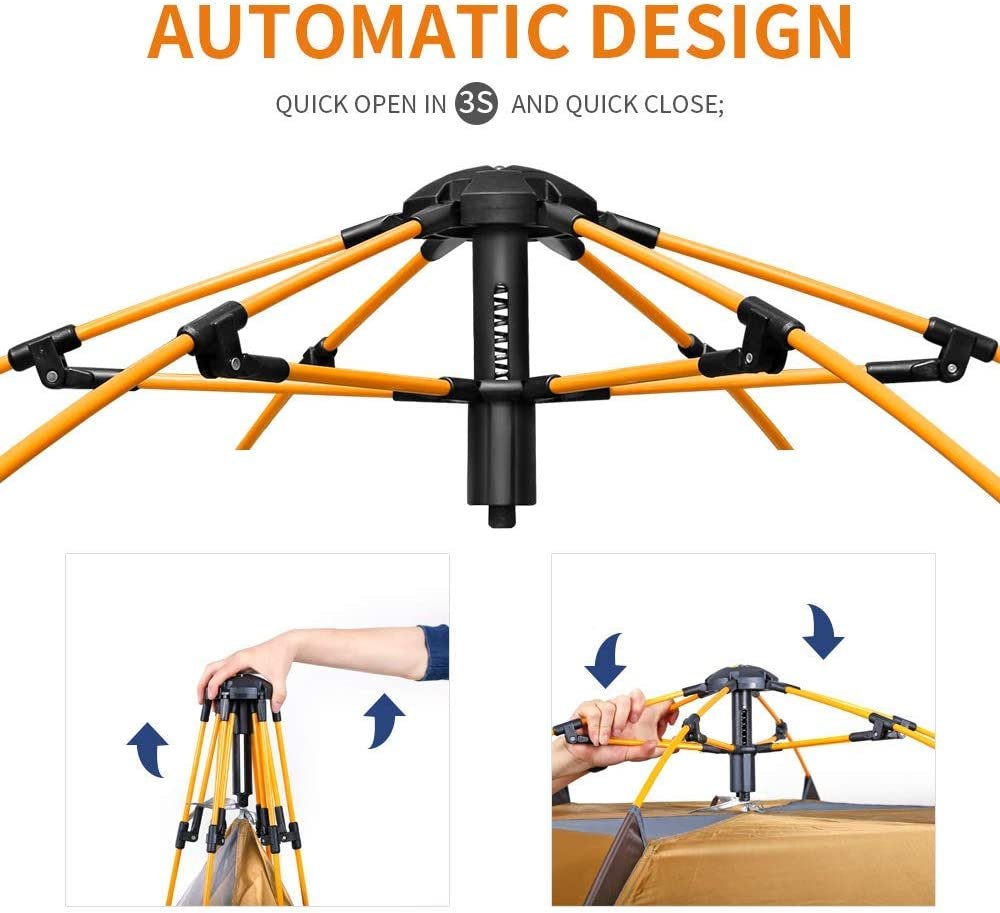 - Fast Pitch Tent with Spacious Interior – Very fast to pop up and take down,the poles and tent material are joined permanently to the poles,and the poles only partly break down, opening it up is as easy as opening an umbrella, hexagon shape with 5ft 5inch center height which let you move comfortably