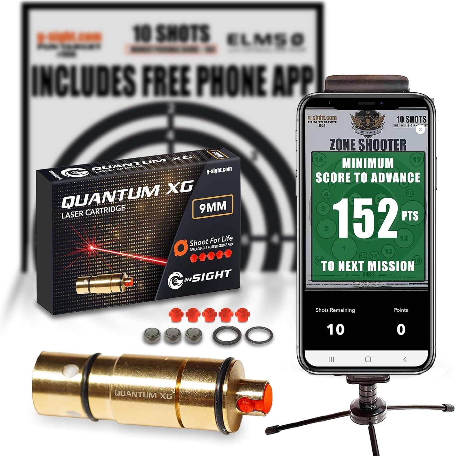 - WHAT’S INCLUDED: QUANTUM XG Laser Cartridge, Metal Mini Tripod and Phone Holder, Auto Programmed app enabled BASIC SHOOTER SMART TARGET, 2 Sets of Batteries, 2 Sets of O-Rings, 6 Replaceable Rubber Strike Pads, FREE SFL Mobile App (download for ios and Android; requires iOS 13.0 / Android 7.0 or newer). For Indoor Shooting