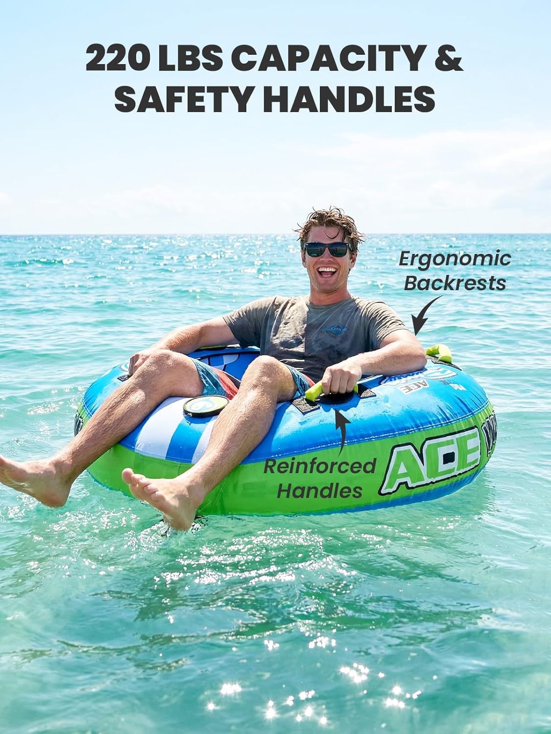 - SECURE RIDE FOR 1-2 RIDERS: Designed with a spacious flat deck, this inflatable tube comfortably holds 1 to 2 riders with a maximum capacity of 340 lbs. It features strategically placed handles with neoprene knuckle guards and EVA foam pads, providing a secure, non-slip grip and full-body support to keep riders safe and balanced during sharp turns and wake jumps